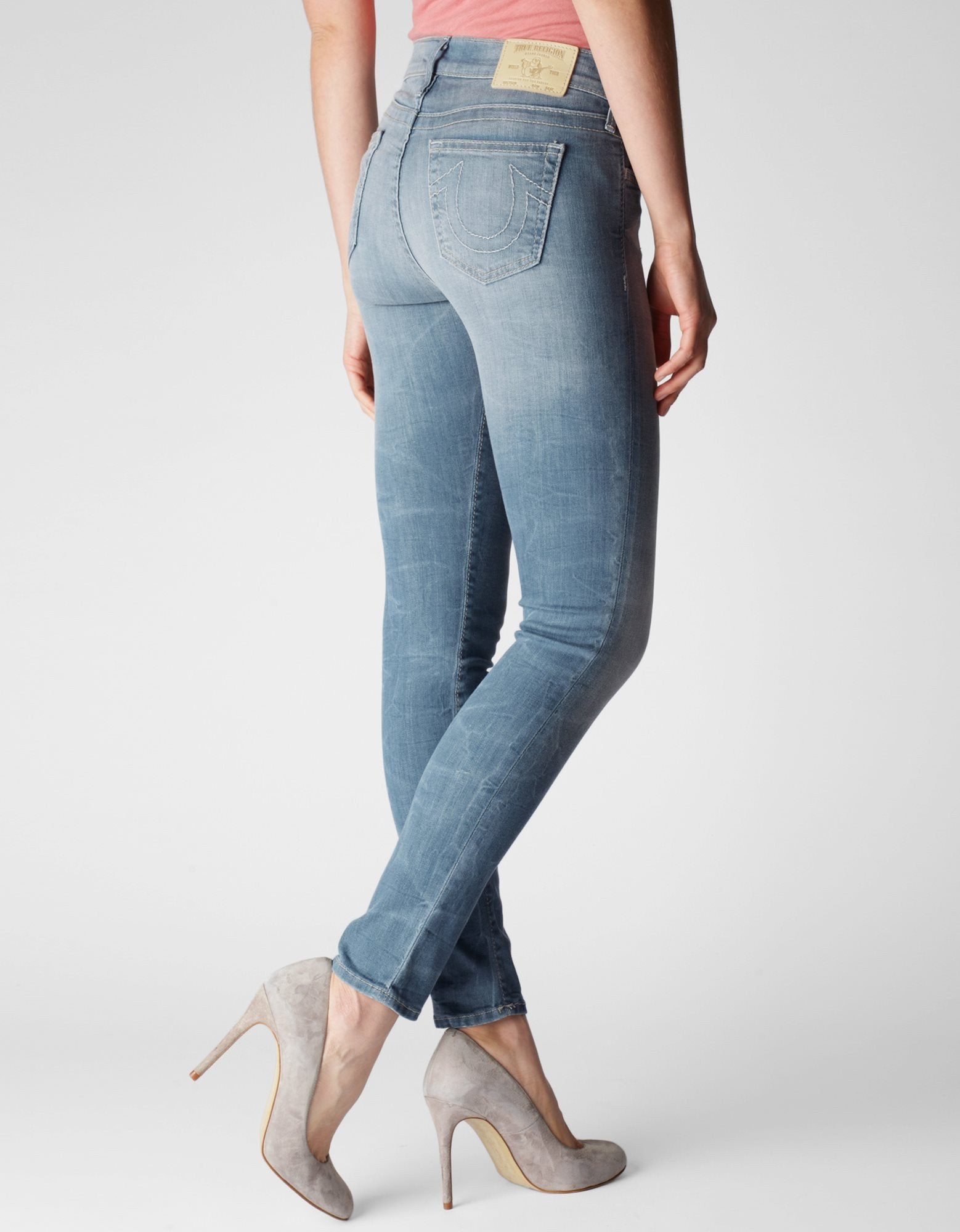 Embrace your inner spirit warrior with clothing that embodies your wild side. A destroyed and distressed skinny jean highlighted by our new Mystic Water wash mirrors the desert sky encountered by our adventurous True Religion woman. The muted palette and soft hand is achieved by a handcrafted wash on lightweight 9.25 oz stretch denim and appears well worn like a beloved pair of pants.