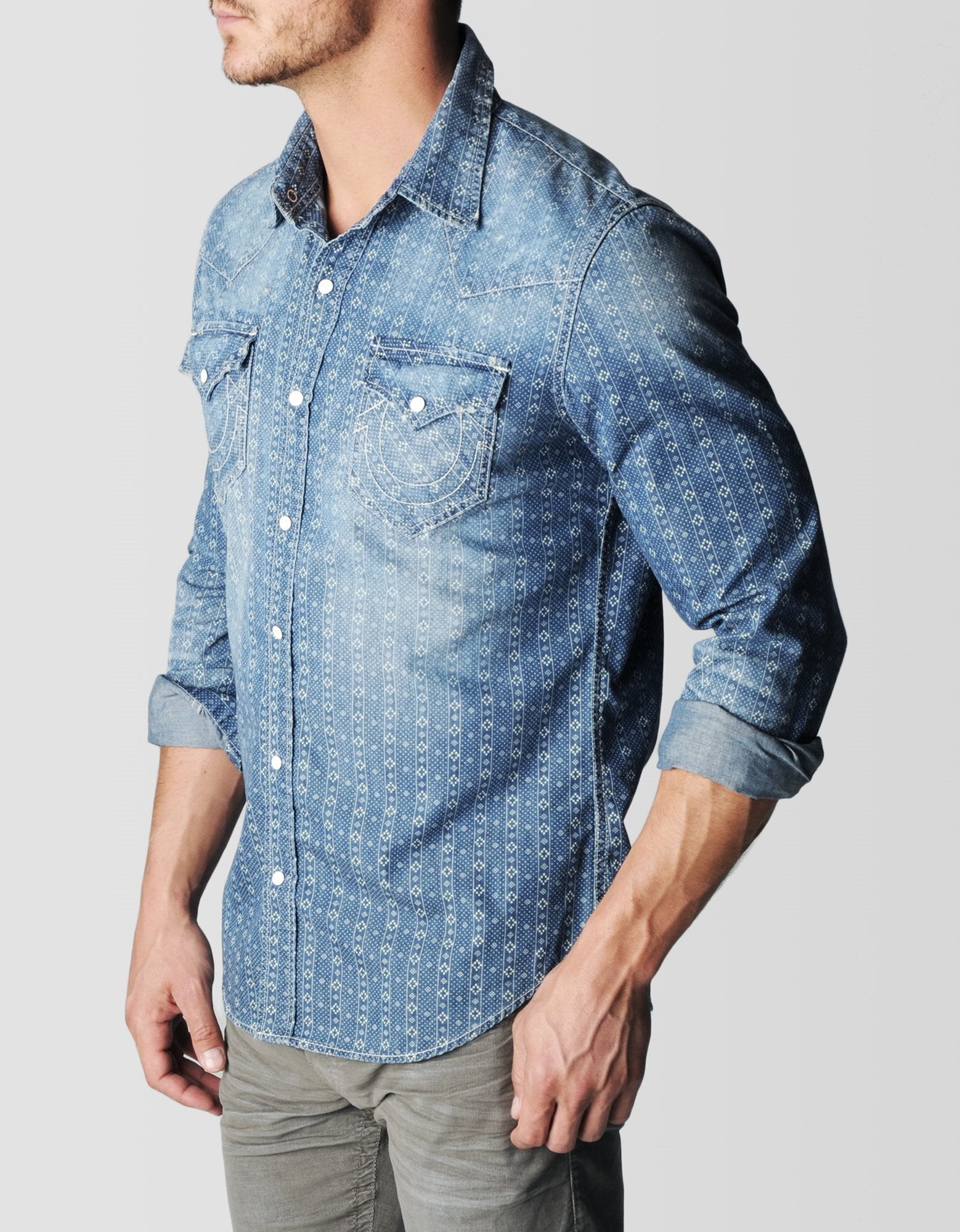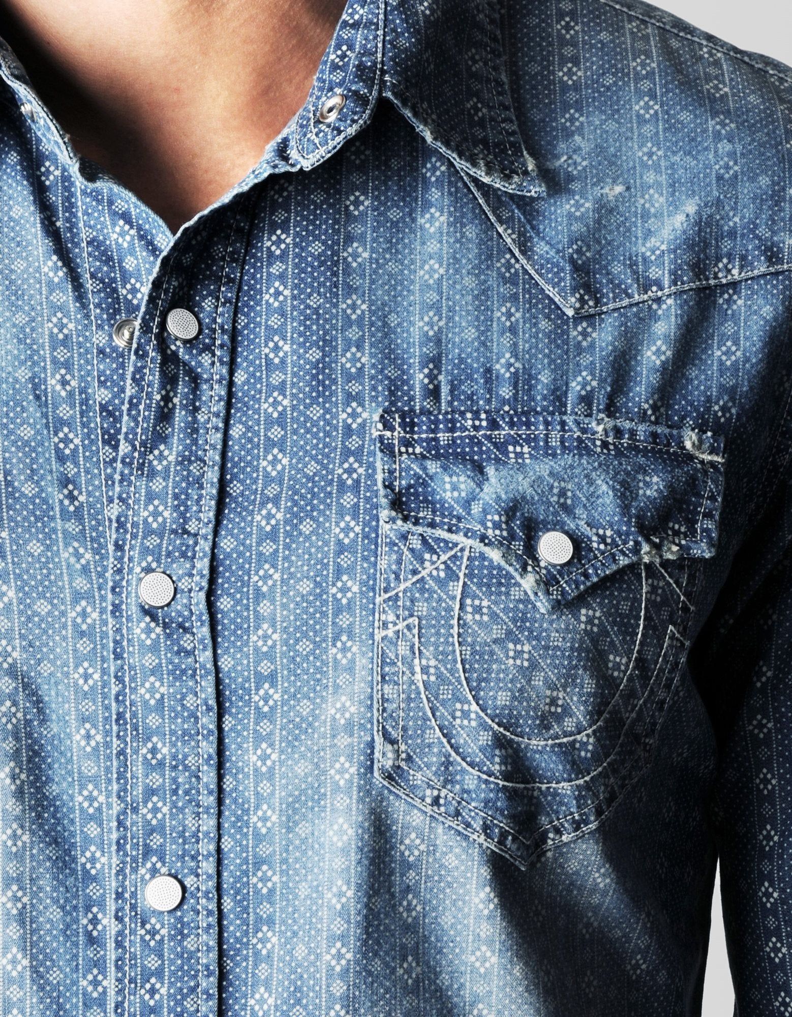 A classic chambray shirt gets a western revival with a traditional print. The vertical pattern is featured on pre-washed and distressed fabric to ensure a natural vintage appearance while the slim fit was made to suit the modern man. Snap buttons, a western yoke and smile pockets are the finishing touches that make this piece authentic.